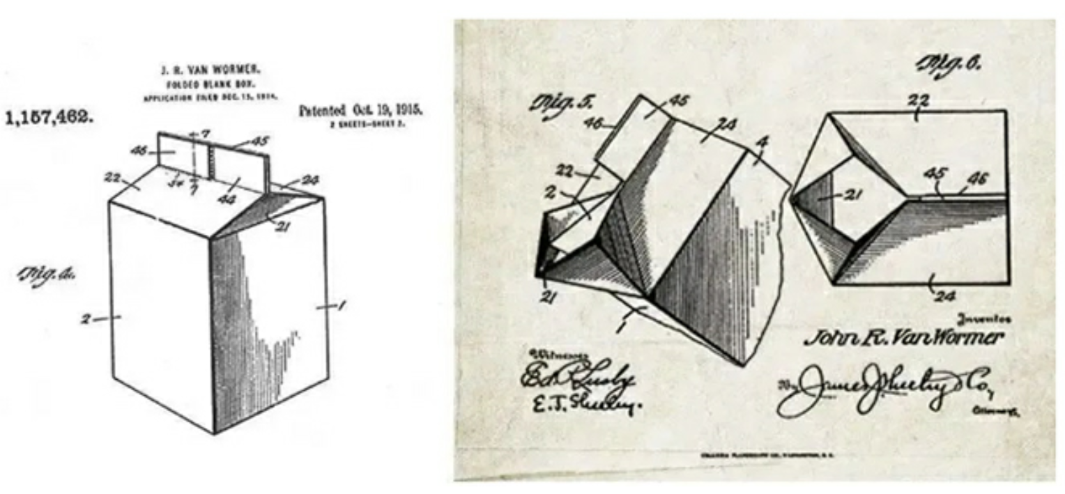 1911年,約翰將牛奶紙盒設(shè)計(jì)為只需單張紙板通過(guò)折疊、拼貼和加封嘴即可完成包裝。成為了屋頂盒的雛形。